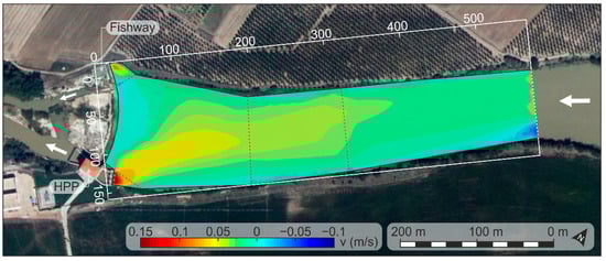 2D velocity contour in the upstream area of the facility (discharge: 9.71 m3/s).