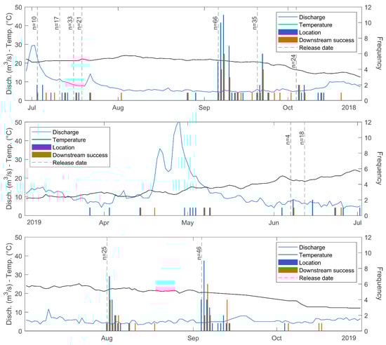 Location and downstream success, related to river discharge and water temperature. The logging system was running continuously from 01/05/2018 to 31/12/2019, however, periods without fish records were excluded from the illustration for clarity reasons.