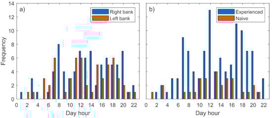 Location frequency at different hours in the day (GMT +01:00). (a) Considering the release bank. (b) Considering fish origin/experience.