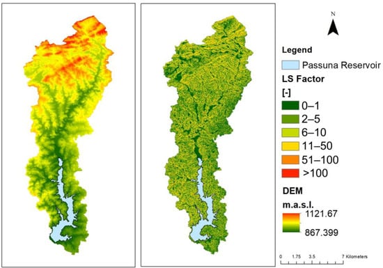 (Left). Digital elevation model; (Right) spatial distribution of LS Factor.