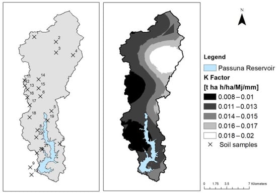 In order to determine the K Factor, two soil sampling campaigns were organized in the Passaúna catchment with a total of 22 soil samples (Figure 3Left). The texture (silt, clay, and sand fractions) and loss on ignition at 550 °C (LOI550) were defined for each sample. For each point, three subsamples were taken as replicates within a radius of 5 m. Disturbed material was dried and sieved in 2 mm mesh, and the texture analysis was undertaken by the Bouyoucos hydrometer method [] based on the classification by the United States Department of Agriculture (USDA), which addresses that the particle sizes between 0.05–2 mm are sand, between 0.002–0.05 mm are silt, and smaller than 0.002 mm are clay. For the samples of the first campaign, also some physical parameters of the soil were measured. All soil samples were used to calculate the K Factor at each location. For this study, Equation (4), proposed by [] for the sample points collected covering Ultisol, Red Oxisol, and Typic Eutraquox classes, was used.
