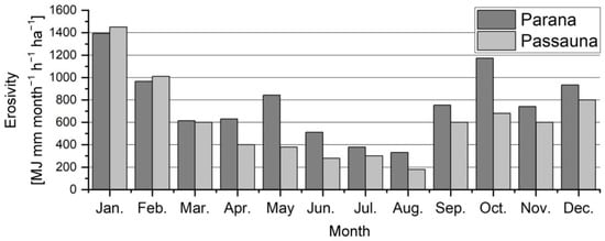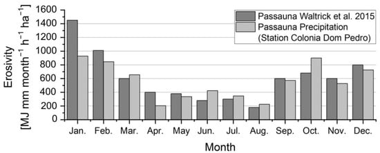 For lack of 10–20 min frequency precipitation data for the Passaúna catchment, initially literature findings were used to determine the rainfall erosivity in the catchment [] studied extensively the relations between the rain erosivity calculated from pluviographic and pluviometric data. Optimally, the rain erosivity is calculated by using long-term pluviographic (disdrometric) data, even though this type of data is mostly unavailable. The pluviometric data is often more easy to access but has a major disadvantage as it gives no information about the duration of the rain []; derived three different equations for three different locations in Parana to relate the erosivity calculated from the pluviometric data (RPm) with the erosivity calculated from the pluviographic data (RPg). Based on the aforementioned research [], calculated the erosivity factor for the whole state of Paraná in a monthly resolution (Figure 4). In their research [], integrated data from 114 pluviometric and pluviographic stations with more than 20 years of data (1986–2008).
