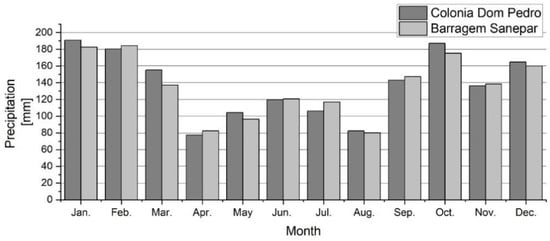 Monthly precipitation for the two locations in the Passaúna catchment.