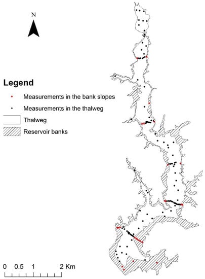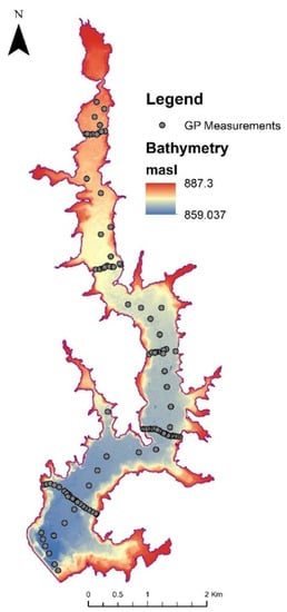For this study, the commercial system GraviProbe (GP) produced by the Belgian company dotOcean (Figure 9) was used. Often, the spatial distribution of sediment thickness in a reservoir can be determined by bathymetric surveys, if precise pre-impoundment bathymetry is available [,,]. Most of the time, this information is missing, and even when it is accessible, often the accuracy of the data does not allow for proper sediment stock estimation. One of the main advantages of the GP is its independence from previous data. The GP can deliver rapid results on penetration depth, cone penetration resistance, and shear strength of the sediment for each deployment. The GP was deployed at 134 points in the Passaúna reservoir (Figure 10). To determine the sediment magnitude, the information from the dynamic cone penetration resistance (DCPR) at some locations in the reservoir was related to the sediment magnitude data from core samples [,]. Characteristic changes in the sediment density/composition were identified and then related to the changes in the DCPR from the GP. The sediment thickness could be derived for all other points, where GP data was available because the relation between DCPR and sediment-pre-impoundment soil interface was established. This was possible due to the fact that the share of sand and coarse particles in the Passaúna sediment is smaller than 5% at most locations and a full penetration could be achieved. From the relation between core samples and GP information, it was observed that a DCPR of 200 kPa is the threshold between the sediment and the pre-impoundment soil. More information about the method can be found in [].