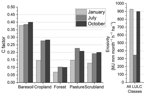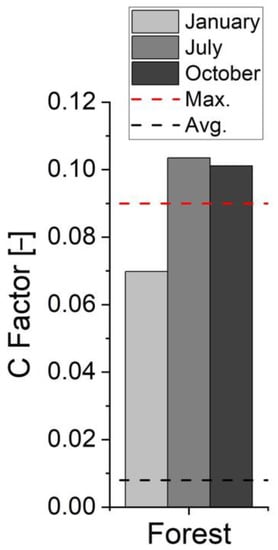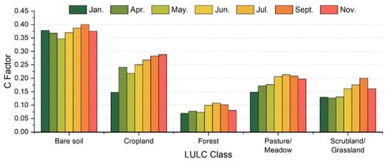 For each of the available NDVI maps, the C factor was computed. The highest seasonal changes in the C Factor values were observed for the cropland (Figure 11). Between January and February, which is harvesting time, and November, which is seeding time, there is a change of almost 100% in the average C Factor of the catchment (from 0.15 to 0.28). A high interannual change in the C Factor was also observed in the scrubland/grassland areas. Winter and spring are characterized by a low vegetation coverage, whereas summer and partially autumn reveal a high vegetation coverage. Forests showed moderate changes mainly because a small percentage of the trees in humid subtropical regions lose their leaves in winter. The seasonal change in the forest average C Factor (change of <0.05 between maximum and minimum average C Factor) can also be related to the misclassification of certain areas with other LULC into forest class. Pasture and meadow follow also a similar land cover pattern. In summer and autumn, the vegetation cover is high, and in winter and spring, it diminishes. Bare soil has the smallest changes of all classes. There is a seasonal change of a maximum of 0.05 among the months and this can be attributed to the errors of the LULC classification process.