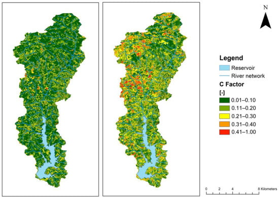 The previously mentioned satellite-derived data was used to calculate the C Factor also in non-sealed urban areas. As can be seen from Figure 7, in the urban areas, the NDVI is in the range of 0.25, which would result in a C Factor of 0.35–0.40, which corresponds to the C Factor values of arable land. Therefore, a filter was applied to the data with the simple logical condition that if a pixel in the urban areas had more than 60% soil sealing, the NDVI at the same location was set to 0.999, as it was assumed that no or very little sediment can occur from sealed areas.