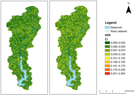 The sediment delivery ratio plays a crucial role in the outcome of the final sediment amount reaching the river, as it is directly related to a large number of factors (amount of soil displacement, geometry of the transporting paths, land cover of the surrounding area, or amount of surface runoff) []. For this study, the SDR was calculated based on the flow connectivity approach by []. Hydrological connectivity is a term often used to describe the linkages between runoff and sediment generation in the upper parts of catchments and the receiving waters []. The use of the connectivity index as an input parameter for SDR has shown satisfying results globally [,,,]. For this study, the calculation of the connectivity index, and subsequently SDR, was implemented in ArcMap 10.5 as described in [] based on the following formula: