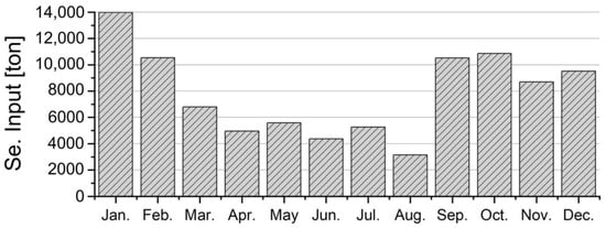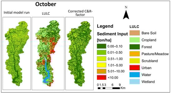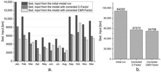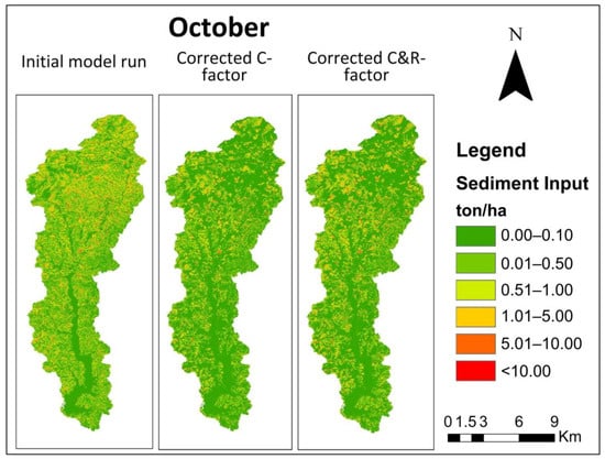 For calculation of , thus the R Factor, the approach by [] (Equation (5)) was applied. The precipitation patterns at both locations are similar; therefore, only one value of erosivity factor was used for the whole catchment (Figure 6).