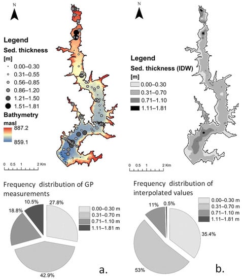 RUSLE results represent averaged long-term (mostly over decades) soil loss and sediment input (when RUSLE is combined with the SDR) from the catchment. When dealing with the results, the challenges are encountered mainly in having a reliable assessment of the sediment input in cases where no monitoring station is available. Due to their high trapping efficiency, large reservoirs with long residence times act as sinks for the incoming sediment. Therefore, they can be used as suitable long-term validation points for sediment input modeling. Several studies were conducted in this regard [,,,]. In order to acquire fast and accurate sediment information in areas where no previous data are available, a so-called portable free-fall penetrometer (PFFP) was used to assess the sediment distribution in the reservoir. PFFPs are not new in marine research (mostly sediment management in harbors), while their application in freshwater is still limited [,,,,,,,,,].