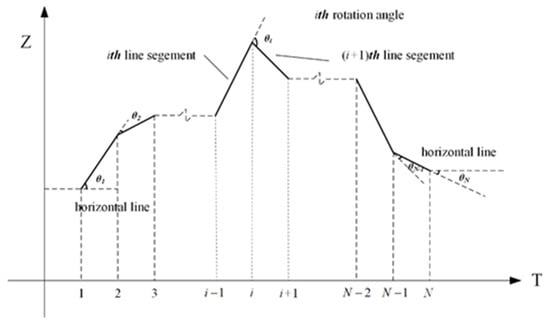 - is an index describing the difference between two processes in terms of contour variations. It is calculated with Equations (3)–(5):where is the angle between two line segments of and is the angle between two line segments of . The rotation angle and line segment of a process are shown in Figure 1. is selected as an example, and for or , is the rotation angle between the first line segment and a horizontal line, is the rotation angle between the last line segment and a horizontal line, and is the slope of the line segment, which is defined by Equation (5).