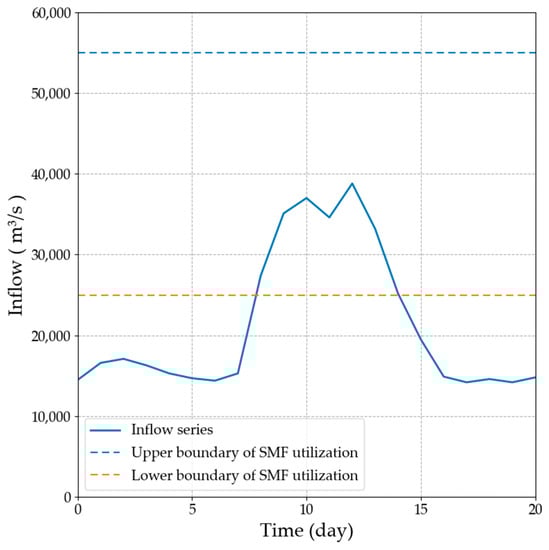 In this case study, the plan period extended from 10 to 30 June. Daily inflow data of the TGR from 10 June 2012 to 30 June 2012 were adopted as input data. The initial water level of the TGR was set to 145 m, and the water level of GZB was set to a fixed value of 66 m. The maximum water level of the TGR during SMF utilization was set to 155 m according to previous research [33] as an additional flood control constraint. The daily inflow of the cascade reservoir system during the plan period is shown in Figure 4.