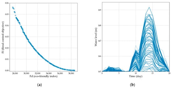 According to Figure 5a, the trade-offs between the conflicting objectives indicate that the eco-goal cannot be improved without worsening the flood control target . Corresponding decision processes in the decision space are shown in Figure 5b.