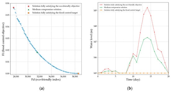 Commonly, after a Pareto optimal set is generated, researchers might select representative solutions [35]. For comparison purposes, we selected three solutions in the same way: the solution fully satisfying the eco-friendly index, the solution fully satisfying the flood control target and a medium compromise solution considering both objectives with the same importance [36]. The medium compromise solution has the closest Euclidean distance (ED) to the utopia point [37] (also called the ideal point). These three solutions are shown in Figure 6 below. Figure 6a presents the distributions of these three solutions in objective space, and Figure 6b shows the corresponding operation processes.