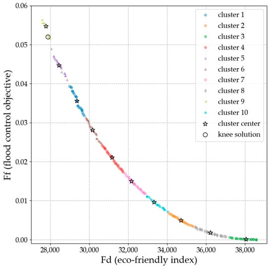 By clustering the Pareto set in objective space, we narrowed the selection range (200 solutions in this case study) to ten clusters with corresponding unique characteristics. In some studies [24,41], cluster analysis is adopted as a practical solutions selection approach. This approach offers the DM a set of k clusters. To make the final decision, the DM is required to select one cluster from among the k clusters. In this case study, if DMs prefer a low flood control risk to better meet the eco-friendly goal, they can choose among the solutions contained in cluster 3, which are the green circles in Figure 7. If DMs have no preference, the cluster that contains the knee region will be the focus. According to [42], cluster 9 is the knee region and a knee solution is marked in Figure 7.