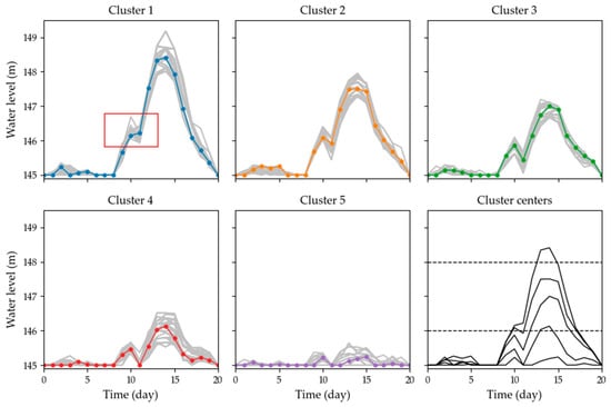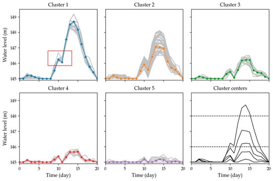 To discover more information about the Pareto optimal results, we clustered the operation processes in the decision space to detect reservoir operation patterns, which facilitates practical water management. In this subsection, the clustering results of the reservoir operation processes obtained through DPC with the new similarity measure MWFSM (MWFSM-DPC) are presented. Compared to DPC with ED (ED-DPC) and DPC with dynamic time warping (DTW; DTW-DPC), the validity of MWFSM was verified. The MWFSM recognized more reservoir operation patterns in the high water level zone.
