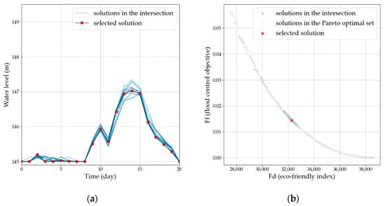 The processes in the largest intersection and the intersection center are shown in Figure 11a. Corresponding objective values are shown in Figure 11b. In Figure 11a, the blue curves represent the reservoir operation processes of the solutions in the intersection. The black curve with red dots represents the center. It shows that for most solutions in the intersection, the water level slightly fluctuated during the early period and decreased to the dead water level before the main flood control operation. Another fluctuation occurred during the rising period on the 10th day, and the highest water level during the flood was observed around the 14th day. All solutions in this intersection shared the same trends except for the early period and the period of the 13th, 14th, and 15th days. It was observed that objective values of solutions around the selected solution were on the Pareto frontier or close to it, which indicates the robustness of the selected solution.