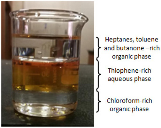 After fixing the SILICONE1200 membrane in the pervaporation cell, 50 mL of distilled water was introduced carefully into the upstream side of the cell. Subsequently, an equivalent amount of organic mixture containing 20 wt.% of each organic component (chloroform, toluene, heptanes, thiophene, and butanone) was added under continuous stirring at 20 °C. As shown in Figure 1, three phases are observed in the upstream of the cell. The top phase essentially contains butanone, toluene and heptanes due to their lowest density (≤0.865 g·mL−1) and their affinities very close to each other, the second in the middle rich in water and thiophene (densities close to 1.0 g/mL) and the third rich in chloroform (1.48 g·mL−1) occupies the bottom of the feed. The characteristics of each components used in this mixture are shown in Table 4.