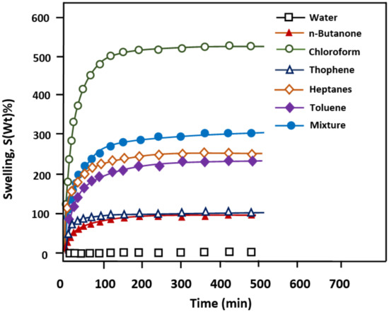 Figure 2 illustrates variation of the swelling degree as a function of time for the mixture and its pure components. Table 6 lists the swelling performance of the SILICONE1200 membrane in the water-organic mixture, along with those of the pure components determined from their maximum absorptions. The maximum swelling of this membrane was achieved with chloroform, in which approximately 552% by weight was absorbed in 2 h. Heptanes had an approximate 250 wt.% increase in weight during in same period. By contrast, butanone and thiophene were the least absorbed among the organic mixture components with similar levels of 90% and 100% by weight of the membrane, respectively. No swelling of the SILICONE1200 membrane was noted when it was immersed in water. By contrast, the water–organic mixture indicated a 300 wt.% degree of swelling, which was intermediate between those of chloroform and heptanes. These results were expected from the difference in the Hansen solubility parameters, ∆δ, between that of PDMS and each pure component, as presented in Table 6. Table 6 lists the interaction parameters determined from the data of Table 4 and Equation (2).
