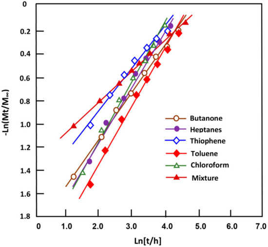 Considering the criterion cited in Section 2.4.2, only a swelling degree less than 60 wt.% was considered, for which Equation (6) was satisfied according to the Comyn approach [51]. Figure 3 illustrates the variation of as a function of Ln (t) for the SILICONE1200 membrane in the mixture and its pure components. The curve profiles revealed straight lines for all organic compounds with slopes (n) close to 0.5, except for the thiophene and the mixture, which were 0.357 and 0.357, respectively. The k value for each component and the organic mixture was obtained from the intercept, as presented in Table 7.