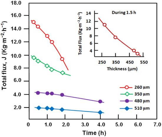 Variation of the total flux versus time obtained with different membrane thicknesses. Conditions: temperature, 20 °C and stirring rate, 500 rpm.