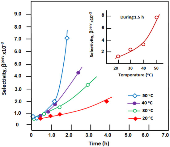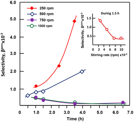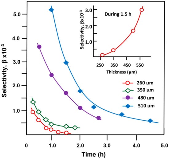 Variation of the membrane selectivity versus time obtained at different thicknesses. Conditions: temperature, 20 °C and stirring rate, 500 rpm.