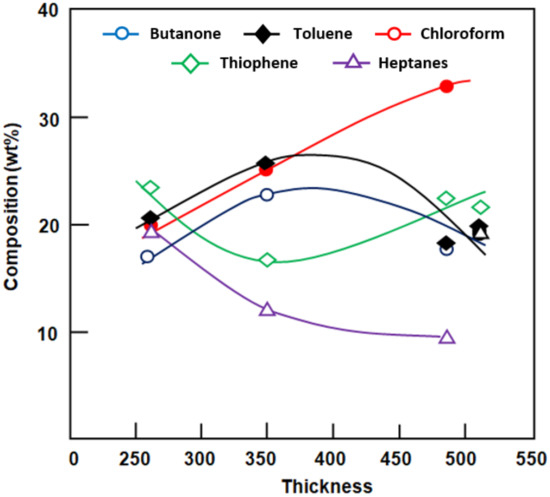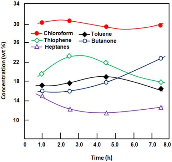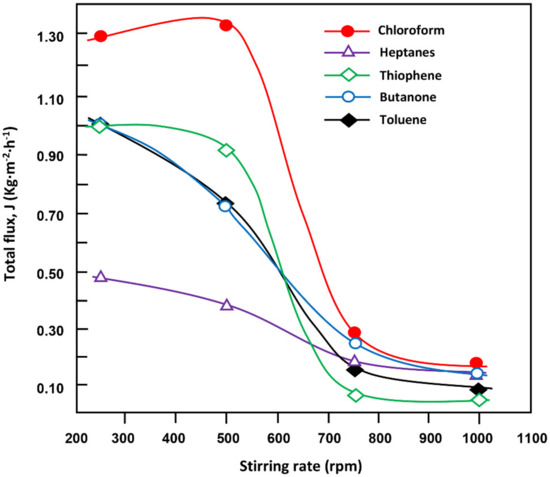 At first sight, the total flux decreased with time and membrane thickness, achieving a minimum of 1.95 kg·m−2·h−1 and 11.03 kg·m−2·h−1 with the thickest (510 μm) and thinnest (260 μm) membranes, respectively, over the 1.5 h duration (Figure 4). As the thickness of the membrane was increased, the total flux became increasingly stable with time. This is because the flux is relatively high when a thinner membrane is used, leading to rapid depletion of the organic mixture, in which the heavy phase in contact with the membrane contains mainly chloroform (Scheme 3). Therefore, the flux also decreases rapidly with time of the separation process. By contrast, a thicker membrane results in a lower total flux and slower depletion of the feed in the organic components. This leads to pseudo-stability of the concentration of organic compounds in the feed at its minimum. The higher total flux observed immediately after starting the separation process was mainly due to the large amount of organic solvents absorbed by the membrane before the pervaporation process was run (−20 min).