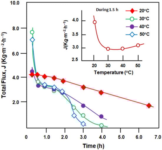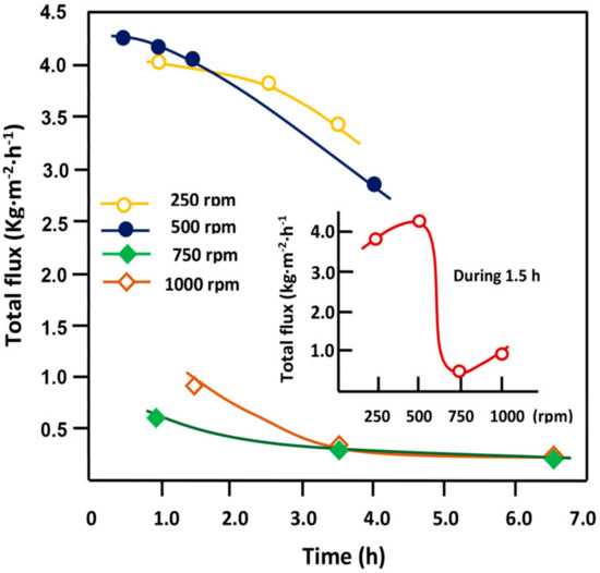 The total flux, J, was determined from the mass measurements of the permeate at the interval time using Equation (10).