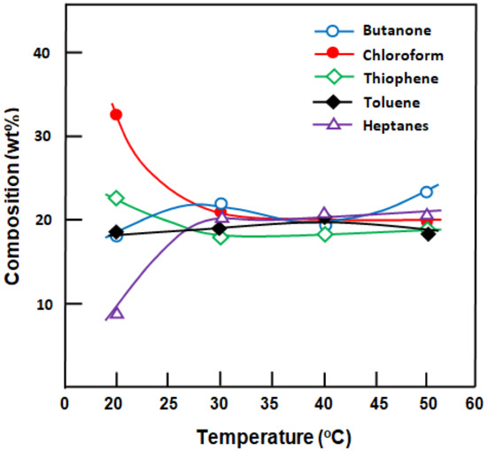 Table 8 lists the composition of the mixture absorbed by the membrane and the selective absorption of the membrane factor (). In general, a slight change in the selectivity of the SILICONE1200 membrane is observed for all components. The order of the composition of each component absorbed followed the same trend as that of its PDMS-solvent interaction parameter and that of its ∆δ values listed in Table 6.