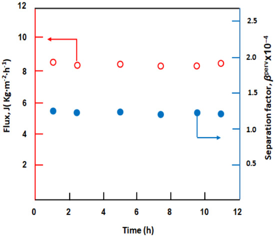 where Po and Pw are the mass of organic compounds and water in the permeate, respectively. Fo and Fw are the mass of organics and water in the feed, respectively. The membrane efficiency was estimated using the pervaporation separation index (PSI) calculated using Equation (12) [54]: