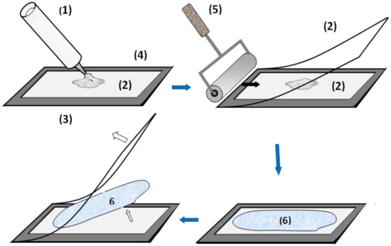 Preparation of the SILICONE1200 membrane. (1) SILICONE1200 tube, (2) sheet of transparent polypropylene paper, (3) metal plate, (4) adhesive tape, (5) rolling pin, and (6) SILICONE1200 membrane.