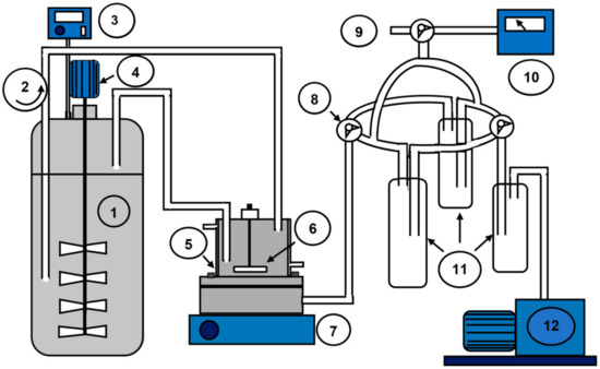 Pervaporation apparatus used in this investigation. 1—Tank (Reservoir); 2—Peristaltic pump; 3—Thermostatic coil; 4—Mechanical stirrer; 5—Pervaporation cell; 6—Hanged magnetic bar; 7—Magnetic stirrer; 8—Three-way Rotaflow valve; 9—Opening to the air; 10—Pirani Gauge; 11—Cold trap; 12—Vacuum pump.