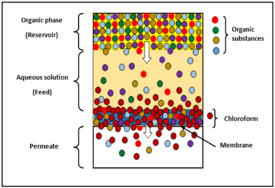 A determined volume of distilled water was introduced carefully into the upstream side of the cell. Subsequently, an equivalent volume of organic mixture containing 20 wt.% of each organic component (chloroform, toluene, heptane, thiophene, and butanone) was then added under continuous stirring at 20 °C. Table 5 shows the initial composition of the feed.