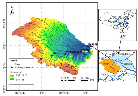 The upper and middle reaches of the Huaihe River Basin (above the Bengbu) (30°57’−34°57’ N, 111°56’−117°31’ E) are located in eastern China between the Yangtze and Yellow River Basins (Figure 1). It spans Henan, Hubei, and Anhui Provinces, with an area of approximately 121,300 km2. The basin is concentrated in population and contains extensive cultivated land. The UMHRB is situated in the climate transition zone between northern and southern China. Taking the main stream of the Huaihe River as the dividing line, north of the line belongs to the warm temperate semihumid zone, while the south belongs to the northern subtropical humid zone. The annual average temperature of the study basin is 11–16 °C, increasing from north to south and from the coast to inland. Cultivated land in the basin accounts for nearly 70% and is mainly planted with wheat, corn, and rice. Sandy loam and clay soil are the main soil types in the basin. The annual average precipitation of the study basin is approximately 920 mm, with large interannual variation and uneven temporal and spatial distributions. The western and southern regions of the basin are mountainous, with a minimum altitude of 800 m, and prone to extreme precipitation [30]. The eastern part of this basin is dominated by plains, with a maximum altitude of 200 m. The large drop makes the extreme precipitation in the mountainous regions rapidly converge to the plains, causing flood disasters.