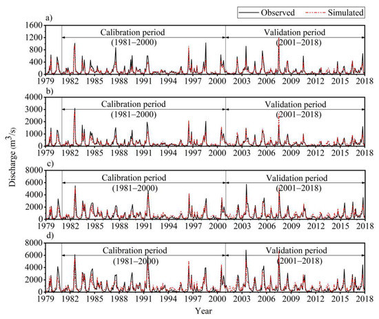 Comparison of observed and simulated monthly discharge at the Xixian (a), Wangjiaba (b), Lutaizi (c), and Bengbu (d) stations for the calibration period (1981–2000) and validation period (2001–2018).