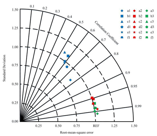 The period 1979–2014 shared by the CMFD and five GCMs was selected as the historical period of bias-corrected meteorological data. Figure 3 compares the average monthly precipitation and maximum and minimum temperatures among the CMFD and raw GCMs and bias-corrected GCMs. The results show that five GCMs overestimated the monthly mean precipitation in spring. The IPSL-CM6A-LR and MIROC6 predicted better in summer precipitation. The prediction effect of temperature was generally better than that of precipitation (Figure 3). The CMIP6 models improved the performance of precipitation prediction, but the uncertainty of monsoon precipitation still exists [51]. Figure 4 shows the correlation coefficient (R), root-mean-square error (RMSE), and the standard deviation (SD) between the predicted values and the CMFD values of precipitation, maximum temperature (Tmax), and minimum temperature (Tmin). The five-GCM ensemble simulation is better than any single model. The R was 0.73, 0.98, and 0.99 in precipitation, Tmax, and Tmin, respectively. The RMSEs were 0.70, 0.20, and 0.13, respectively, and the SD was 0.84, 0.99, and 1.00, respectively. Therefore, the five-GCM ensemble can drive the VIC model to study the hydrological response of the UMHRB under climate change.