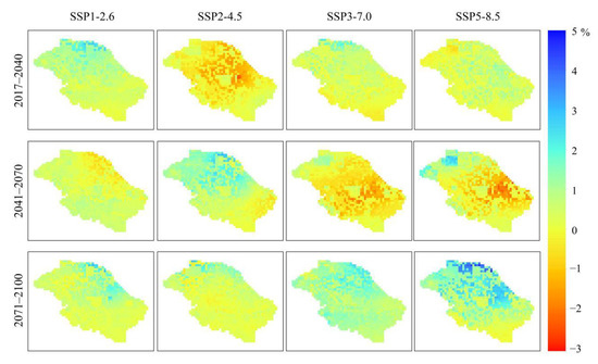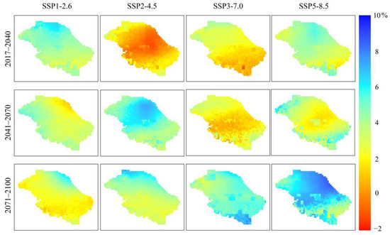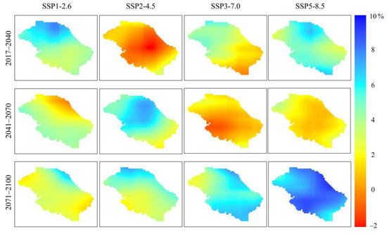 Table 4 shows that the annual averaged precipitation is 936.7 mm in the historical period (1981–2014). In the future, precipitation increases to different amounts in three periods under the four scenarios. Under the SSP1-2.6 scenario, the annual averaged precipitation values are 982.2, 1014.0, and 1044.7 mm in the near-term (2017–2040), mid-term (2041–2070), and late-term (2071–2100) future, respectively. Precipitation increases continuously in the future, and the average relative increasing rates are 4.9%, 3.2%, and 3.0% in three future periods. In the near-term, the precipitation changes gradually increased from south to north (Figure 5). In the mid-term, the precipitation decreases in the grids at the northeastern edge of the basin and increases in other places. In the late-term, precipitation in the western and southeastern parts of the basin increases slightly (2%) compared to the mid-term, and the average increases in other areas (4%). Under the SSP2-4.5 scenario, the annual averaged precipitation values are 938.6, 986.6, and 1026.9 mm in the near-term (2017–2040), mid-term (2041–2070), and late-term (2071–2100) future, respectively. The annual precipitation changes very little in the near-term, but spatially there is a decreasing trend at the center of the basin, while a slight increase occurs in other places. The average annual precipitation in the basin increases by approximately 5.1% in the mid-term with respect to that in the near-term; the increase in annual precipitation from northwest to southeast is a trend of low–high–low. The average relative increasing rate is 4.1% in the late-term. The precipitation changes gradually increase from south to north. The annual averaged precipitation values are 963.1, 970.3, and 1023.9 mm in three periods under the SSP3-7.0 scenario. In the near-term, the precipitation in the southern marginal zones decreases slightly, while in other areas precipitation increases (2.8%). The changes of precipitation in the mid-term are not obvious compared with the near-term. The average relative increasing rate is 0.7%. The increase in annual precipitation projected in the late-term is higher than that projected in the near-term and mid-term, with an average increase of 5.5%. In the SSP5-8.5 scenario, the average relative increasing rate of precipitation is the same as the SSP1-2.6 scenario (4.9%) in the near-term. The relative increasing rate drops to 1.6% in the mid-term. However, the precipitation increases significantly (7.7%) in the late-term compared with the mid-term. The annual averaged precipitation value is 1076.3 mm, which is the largest precipitation value among the four scenarios at the end of the 21st century.