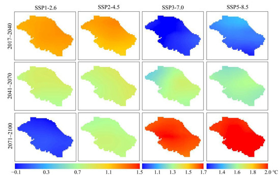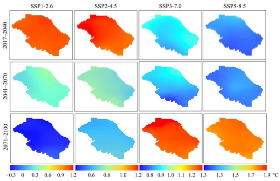 Future maximum temperature changes (1981–2014 vs. 2017–2040, 2017–2040 vs. 2041–2070, and 2041–2070 vs. 2071–2100) in the UMHRB.