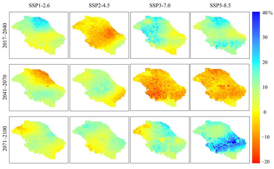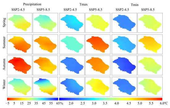 This paper analyzes the seasonal changes of future hydroclimatic parameters under two typical scenarios (SSP2-4.5 and SSP5-8.5). Figure 11 shows changes of the climate parameters in the basin between 1981–2014 and 2071–2100. Under the SSP2-4.5 scenario, the precipitation increases by 24.3%, 6.4%, −2.0%, and 30.0% in spring, summer, autumn, and winter, respectively. Spatially, the precipitation changes gradually increase from southeast to northwest (ranging from 17.9% to 32.9%) in spring. The least increase is in summer (ranging from 0% to 15.0%). Autumn is the only season in which there is a decrease in precipitation (ranging from −5.1% to 0%), and the precipitation in winter has the largest increase rate. Compared to 1981–2014, the maximum temperature of 2071–2100 increases by 2.9, 3.3, 2.3, 2.4 °C in spring, summer, autumn, and winter, respectively. The minimum temperature increases by 2.4, 2.7, 2.0, and 2.3 °C in spring, summer, autumn, and winter, respectively. The maximum and minimum temperature increase is highest in summer and lowest in autumn. Under the SSP5-8.5, the precipitation increases by 32.0%, 8.3%, 10.5%, and 30.4% in spring, summer, autumn, and winter, respectively. The precipitation changes in spring and winter gradually increase from southeast to northwest, with increasing rates of 26.5–36.4% and 8.6–62.5%, respectively. Less of an increase in precipitation is projected in the other two seasons. The rates of increase are 5.5–12.4% and 4.1–16.1% in summer and autumn, respectively. The maximum temperature increase is the largest in summer (5.6 °C) and the least in spring (4.3 °C). The minimum temperature increase is largest in summer (4.78 °C), while the other three seasons have similar increases. Overall, under the SSP5-8.5, variation trends of the climate parameters are basically the same as SSP2-4.5, but the increment is larger than SSP2-4.5. During 2071–2100, the precipitation increase rates are lower in summer and autumn, and the increase rates are higher in spring and winter, and the temperature rises most in summer.