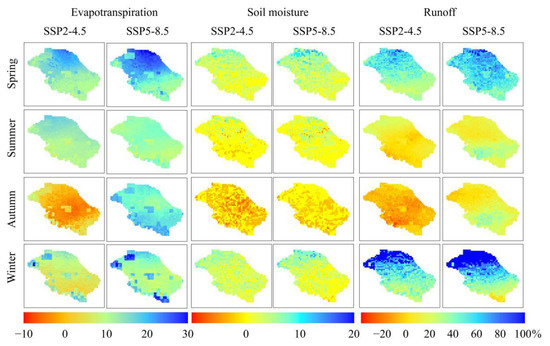 Figure 12 shows the changes of hydrological parameters in the basin, with a comparison between 1981–2014 and 2071–2100. Under the SSP2-4.5 scenario, the evapotranspiration increases by 14.5% and 12.6% in spring and summer, respectively. The distribution of evapotranspiration changes in these two seasons is consistent with the annual value, which gradually increases from south to north. In autumn, evapotranspiration increases in the northwest and southeast edges and several grids in the middle of the basin, but decreases in other regions, and the mean value of the basin remains unchanged compared to that in 1981–2014. In winter, the evapotranspiration begins to increase again by 8.9%. The average change rates of soil moisture are within ±4% in the four seasons. The autumn is the only season when soil moisture decreases (−2.2%). The average soil moisture increases slightly by 0.5–3.3% in other seasons. The runoff increases significantly in spring and winter by 42.5% and 56.6%, respectively. The increase of runoff in summer is small, with an average of 5%, and the runoff has a downward trend in autumn, with an average decrease of 9.9%. Under the SSP5-8.5, the evapotranspiration increases by 18.1%, 11.3%, 15.4%, and 13.0% in spring, summer, autumn, and winter, respectively. Except for summer, the average increase amplitude is larger than that under the SSP2-4.5 scenario. In terms of soil moisture, the distribution of the change is similar to that under the SSP2-4.5 scenario. In autumn, the average soil moisture still decreases by 1.1%. The runoff increases in the four seasons under the SSP5-8.5 scenario, and the order of average increase amplitude of each season is winter > spring > summer > autumn.