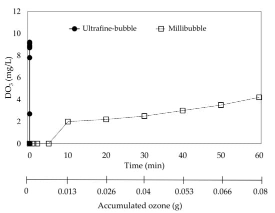 Concentration of dissolved ozone during ultrafine-bubble ozonation with deionized (DI) water (flow rate 40 mL/min; temperature 25 °C; pH 6.5).