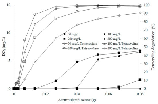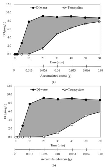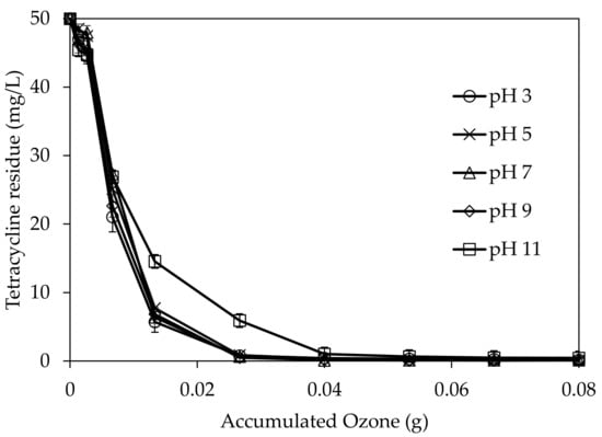 It is well-known that direct attack of organic molecules by mechanisms at acidic condition is the major reaction, and ·OH radicals oxidation mechanisms dominate the degradation of refractory organic pollutants at basic conditions []. In addition, tetracycline contains two acidic groups and one alkaline group so that there are four different species in the aqueous phase at different pH values [], and these different pH values would induce the tetracycline oxidation to take place in different functional groups. In this study, the initial pH levels were varied from 3 to 11 to investigate the effect of pH on the degradation and mineralization of tetracycline. The profiles of the tetracycline residues during ultrafine-bubble ozonation are shown in Figure 3. The residual concentrations of tetracycline after 60 min’ reaction (accumulated ozone = 0.08 g O3) at all pH levels were comparable, with values between 0.24 and 0.44 mg/L, and the degradation percentages were all higher than 99%. However, at low pH, the degradation of tetracycline occurred within a reaction time of 20 min (0.026 g O3), which indicates that lower pH assists tetracycline degradation, due to a cationic tetracycline species observed in aqueous solution, and the oxidization potentials of ·OH radicals are higher in acidic medium than in basic medium [,,,]. Besides the type of tetracycline presented in solution, the concentration of dissolved ozone may be the key parameter affecting the degradation of tetracycline. Figure 4a shows that at pH 3, no dissolved ozone was detected for the first 10 min. The dissolved ozone concentration then increased to 7.8 mg O3/L by the end of the reaction. At pH 11, the concentration of dissolved ozone was still zero after 20 min’ reaction, after which it steadily increased to 6.3 mg/L (Figure 4b). Based on the integration, the grey areas in Figure 4a,b were 289.2 and 364.2, respectively, which estimates that the consumption of dissolved ozone for tetracycline degradation is equivalent to 0.048 g O3 and 0.060 g O3 at pH 3 and pH 11; this indicates that each gram of O3 can degrade 1.041 g and 0.833 tetracycline, respectively. However, as the results show in Figure 3, 20 min of ultrafine-bubble ozonation was adequate to degrade most tetracycline at pH 3 to pH 9, which indicated that the required ozone dosage was 0.018 g O3 (grey area was 108) to degrade 49 mg/L tetracycline. Hence, at those conditions, each gram of ozone could degrade 2.72 g tetracycline. At pH 11, ultrafine-bubble ozonation should be carried out for at least 30 min to degrade 49 mg/L tetracycline, which indicated that the required ozone dosage was 0.033 g O3 (grey area was 199) and each gram ozone could degrade 1.48 g of tetracycline.