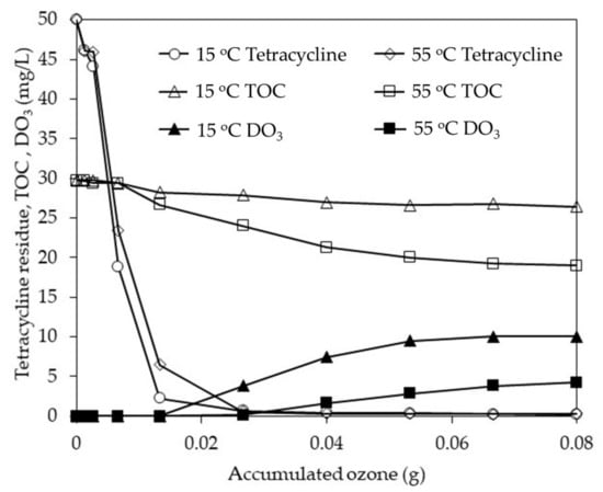 Though temperature had little effect on the degradation of tetracycline, the rate of TOC removal and change in cell viability were both affected. Increasing the reaction temperature increased the TOC removal and cell viability, which demonstrates that higher reaction temperatures resulted in the conversion of organic molecules to CO2, thus reducing the toxicity of the solution. This is explained by the increased reactivity between organic compounds and ozone at higher temperatures [,]. However, lower reaction temperatures increase the solubility of ozone and the mass transfer of ozone from the gas to the solution phase [,,,]. This explains why, in Figure 5, the residual tetracycline concentration after ten minutes’ reaction at 15 °C was lower than at 55 °C. The degradation rate was slightly faster at lower solution temperatures because of the higher dissolved ozone concentration. In fact, only 20 min’ reaction was needed to achieve this high treatment performance. The ultrafine-bubble ozonation method effectively degrades tetracycline regardless of the reaction temperature, so controlling the reaction temperature need not be prioritized.