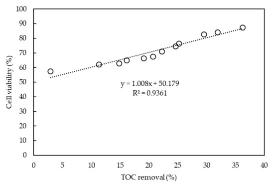 Although ultrafine-bubble ozonation effectively degraded tetracycline with a maximum TOC removal rate of 36.2%, more than 60% of the degraded tetracycline was not mineralized to CO2 by the oxidation process. The toxicity of tetracycline and its degradation by-products of environmentally relevant bacteria was investigated and found that the minimum inhibitory concentration of tetracycline was 2.0 mg/L, much lower than most tetracycline degradation by-products []. However, even tetracycline might be degraded as a by-product by oxidation methods, the possible by-products still contained four aromatic rings in the molecular structures. Hence, full mineralization should be considered as the priority. Changes in the toxicity of the solution based on cell viability measurements must also be evaluated along with the degradation efficiencies. Twelve experimental runs were carried out (Table 1 and Table 2), and the rate of TOC removal is plotted against cell viability in Figure 7. Prior to degradation, the cell viability of untreated 50 mg/L tetracycline was 55.3% ± 11.6%, while the cell viability of a blank sample (DI water) was 100%. The TOC removal rate was strongly correlated with the cell viability (R2 = 0.94), which indicates that the higher mineralization of tetracycline decreased the toxicity of the solution. This demonstrates that TOC removal during the degradation of organic compounds is the critical factor in reducing toxicity []. After the toxicity of tetracycline is reduced by the oxidation process, the wastewater should be subjected to further biological treatments to reduce the concentrations of other chemicals.