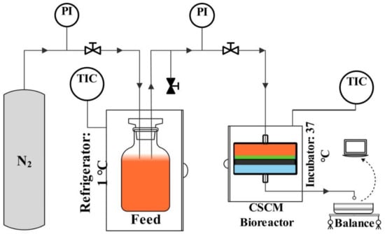 A scheme of the lab-scale CSCM bioreactor system is shown in Figure 1. The compact bioreactor consisted of a filtration cell holding the 47 mm diameter CSCM with a retentate chamber of 5 mL. The 200 mL feed solution was comprised of a 1:3 ratio of azo dye and sodium acetate and basal media with microelements described previously. The feed bottle was kept in a refrigerator (Selecta Group SA, Madrid, Spain) at 1 ± 1 °C to prevent the uncontrolled growth of microorganisms and thus to avoid the consumption of sodium acetate outside the bioreactor. Nitrogen gas was flowing into the feed tank to pressurize the system and control the flux through the membrane by manually setting the transmembrane pressure (TMP). Besides, sparging of nitrogen gas in the liquid phase at the feed tank served to maintain the negative redox potential as a measure of the anaerobic condition throughout the process needed to conduct the dye biodecolorization [52].