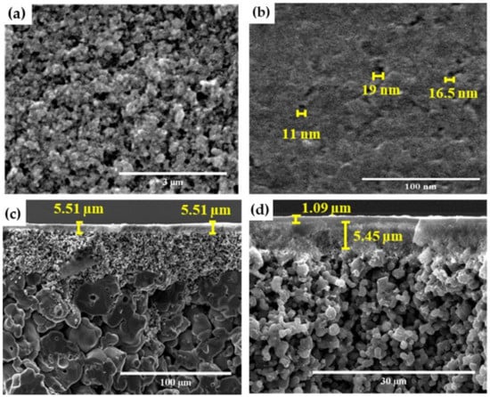 The ESEM images represent the morphology of the CS, and CSCM resulted from carbonization of 10% wt. polymeric precursor. The surface view and cross section of the CS and CSCM are shown in Figure 2a–d. The CS was found to have three layers, with the smallest active porous layer at the top, an intermediate layer in the middle, and a porous supporting layer at the bottom. In CSCM, an extra 1.09 µm porous carbon layer was observed besides these three layers (as shown in Figure 2d). Each carbon and supported layer, however, was not uniform and represented uneven thickness and level.