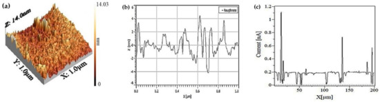 Topographic and current sensing images of the carbon membranes were obtained with AFM (at a random area of 1 × 1 µm2) and current sensing atomic force microscopy (CSAFM), as shown in Figure 3a–c. Tapping mode AFM, which avoids the drag of tips across the sample surface [56], was employed in this experiment to achieve the high-resolution topographic images of the CSCM surface. AFM section images of Figure 3a showed that the CSCM surface was slightly rough and comparatively thin.