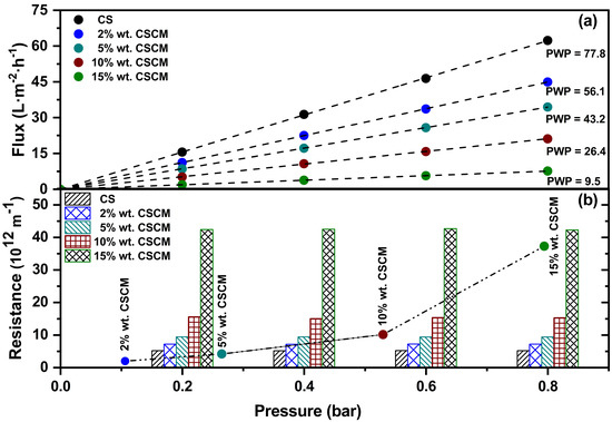 The permeate flux and hydraulic resistance mostly govern the membrane filtration process. A comparative experiment was performed between the CS and CSCMs to assess these characteristics. Variation of the flux and resistance of CS and CSCMs (prepared by 2, 5, 10, and 15% wt. of Matrimid solution) are presented in Figure 4a,b. Not surprisingly, CS exhibits higher flux, 62.3 L·m−2·h−1. In the case of CSCM, it gradually decreases with increasing precursor concentration, and the lowest flux (7.5 L·m−2·h−1) was obtained for the CSCM made of 15% wt. of Matrimid polyimide solution. In comparison to the ceramic support, it is observed that the pure water flux for 2% wt., 5% wt., 10% wt., and 15% wt. CSCM dropped 27%, 44%, 66%, and 88%, respectively. The pure water permeability (PWP) obtained from the slope of Figure 4a) also showed a similar pattern where the highest permeance (77.8 L·m−2·h−1·bar−1) was obtained for CS, and thereafter, the PWP of the 15% wt. CSCM decreased up to 9.5 L·m−2·h−1·bar−1.