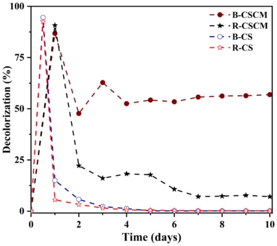 The continuous experimental treatment was carried out under anaerobic conditions to promote the reduction of the model azo dye, AO7. The comparative decolorization of azo dye was studied between the ceramic support and ceramic supported carbon membrane. In these experiments (as shown in Figure 5), reactors that use a mixed microbial consortium are referred to as B-CS and B-CSCM, while reactors that do not use it are referred to as R-CS and R-CSCM. The carbon-based membrane reactors were composed of 2% wt. Matrimid polyimide solution. Four compact reactors were operated at once over 50 mg·L−1 AO7 feed solutions. During the ten consecutive days of operation, it is evident that the presence of a carbon layer was found to have a significant influence on the decolorization of AO7, as shown in Figure 5. Overall, it was observed that CSCM bioreactors (B-CSCM) performed a maximum decolorization rate.