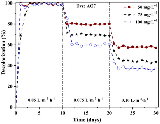 A series of B-CSCMs were simultaneously operated to assess the impact of initial AO7 dye concentration and permeate flux on decolorization efficiency. Consequently, three B-CSCMs were run at feed concentrations of 50, 75, and 100 mg·L−1, respectively. Each reactor was started from the lowest flux (0.05 L·m−2·h−1), and when the steady operation was achieved, step by step, flux was first increased to 0.075 L·m−2·h−1 and finally to 0.1 L·m−2·h−1. The permeate flux was set by varying the operating pressure. A small fluctuation was observed in the operating flux, and it was controlled by modifying the TMP; nonetheless, the decolorization rate was very stable. The decolorization efficiency depicted in Figure 7 illustrates that the maximum color removal was obtained at a low flux (0.05 L·m−2·h−1) and initial concentration (50 mg·L−1); as expected, it declined with higher permeate flux and feed concentration. In that low flux-region, the color removal was essentially complete, and no differences can be observed for the different feed concentrations. After that, for B-CSCMs operating with 100 mg·L−1 of dye solutions, it was observed that the gradual reduction of decolorization was due to the rise of feed concentration and permeate flow. Results showed that efficiency of decolorization decreased to 60% at a flux of 0.075 L·m−2·h−1, and 36% for 0.10 L·m−2·h−1.