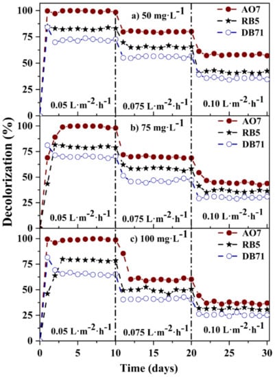 In any case, all B-CSCMs showed stable performance. The short contact time, i.e., high flux inhibits prolonged toxicity and dye deposition on biomass, makes the environment more favorable for microorganisms to outlive. This finding reflects those of Franciscon et al. [79], where the dyes with mono azo bonds were more likely to decolorize quicker than those with diazo or triazo groups. However, at a lower flux (0.05 L·m−2·h−1), the decolorization effect by the initial dye concentration was not observed very much. For instance, Figure 8a–c showed that, at this stage, around 98%, 80%, and 68% of decolorization was achieved for the various concentrations of AO7, RB5, and DB71, respectively. It is assumed that the dye decolorization response with higher contact time favors the well-built microbial growth and efficient biodegradation operation. Hence, there was a significant correlation between feed dye concentration and permeate flux, and an optimum value should be required to operate the decolorization process efficiently.